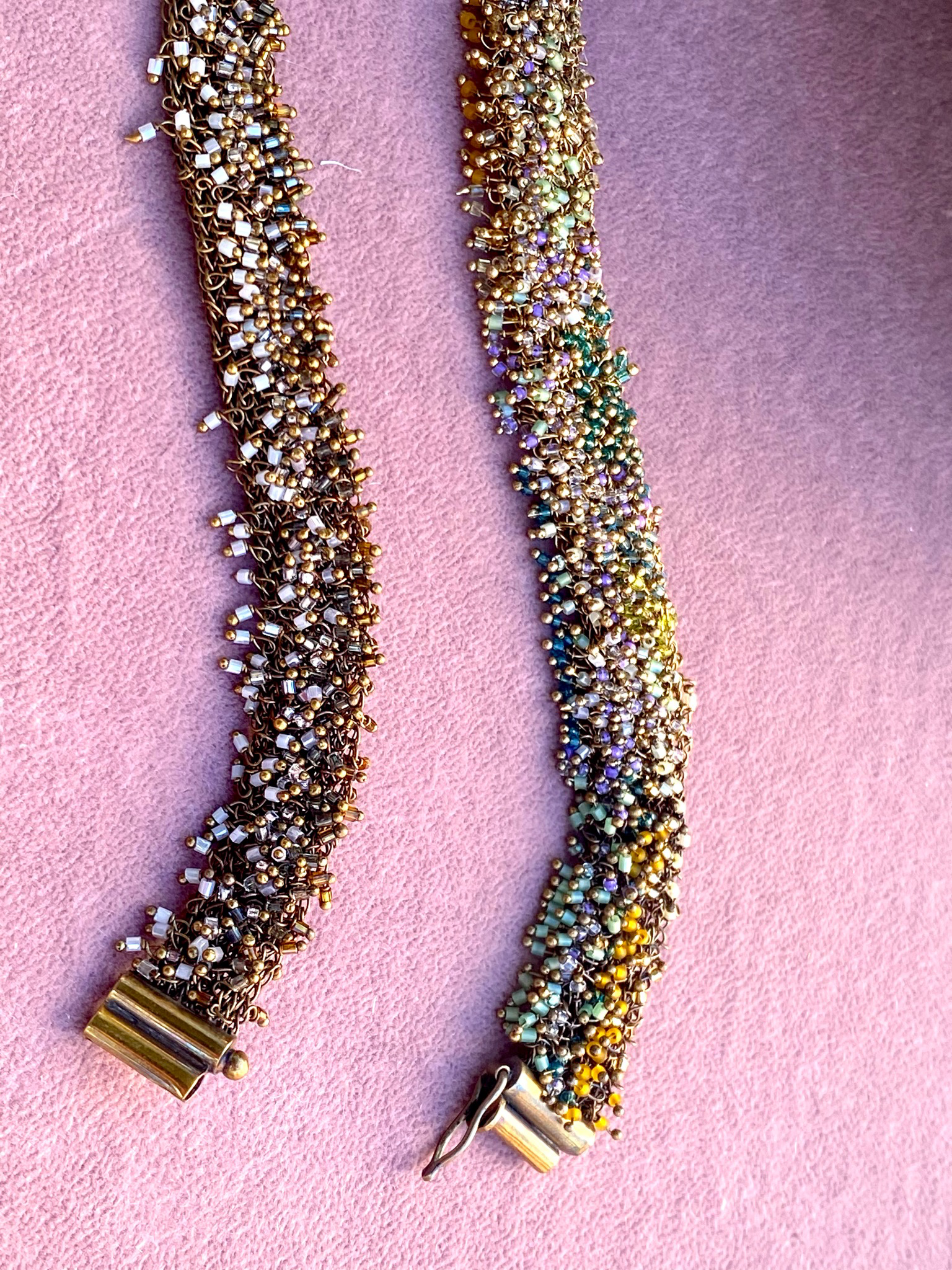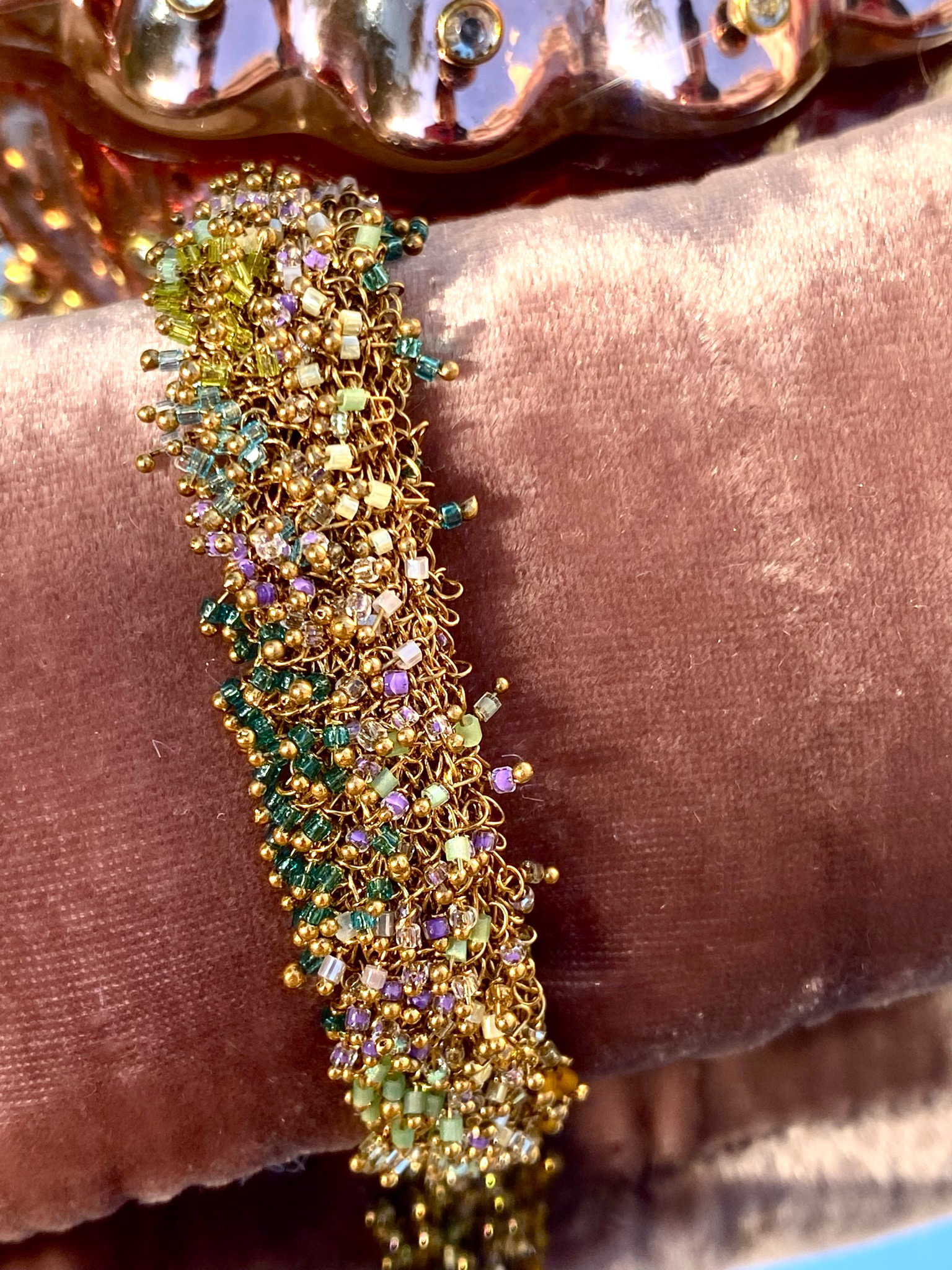 Bracciale maglia filo ottone osdidato intrecciato ad uncinetto . Applicazioni di micro cristalli . Lavorazione artigianale intera realizzata a mano .