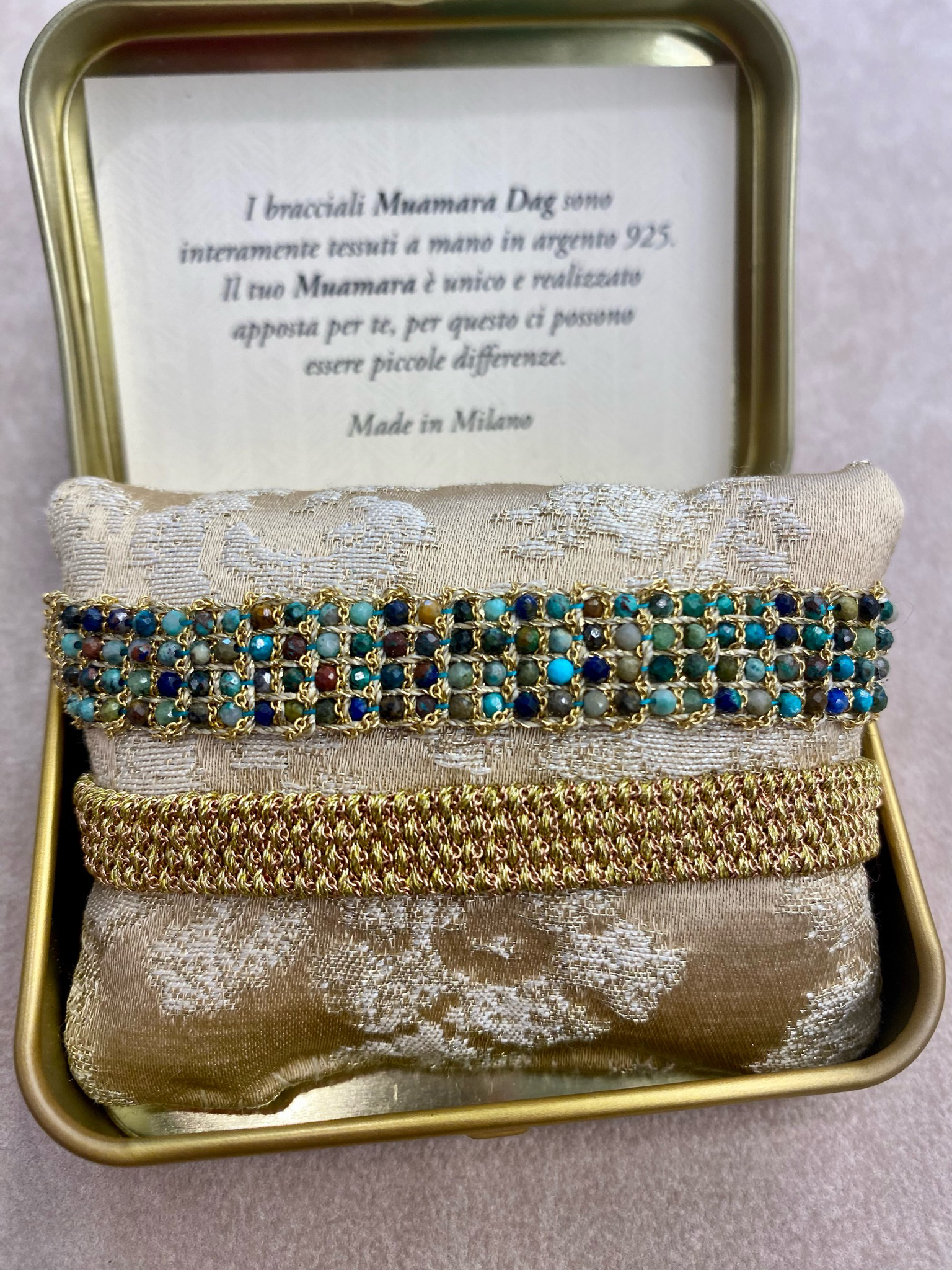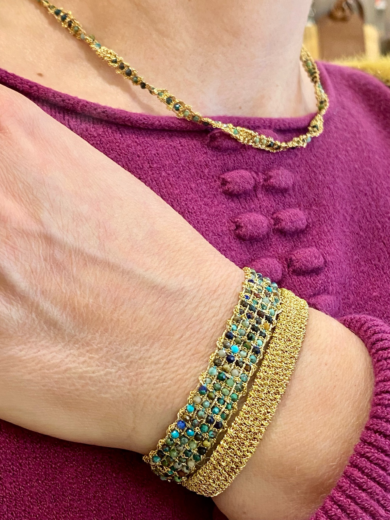 Bracciale tessuto a mano in argento dorato e micro perle di crisocolla e corniola sfaccettate mm 2 . lunghezza regolabile.