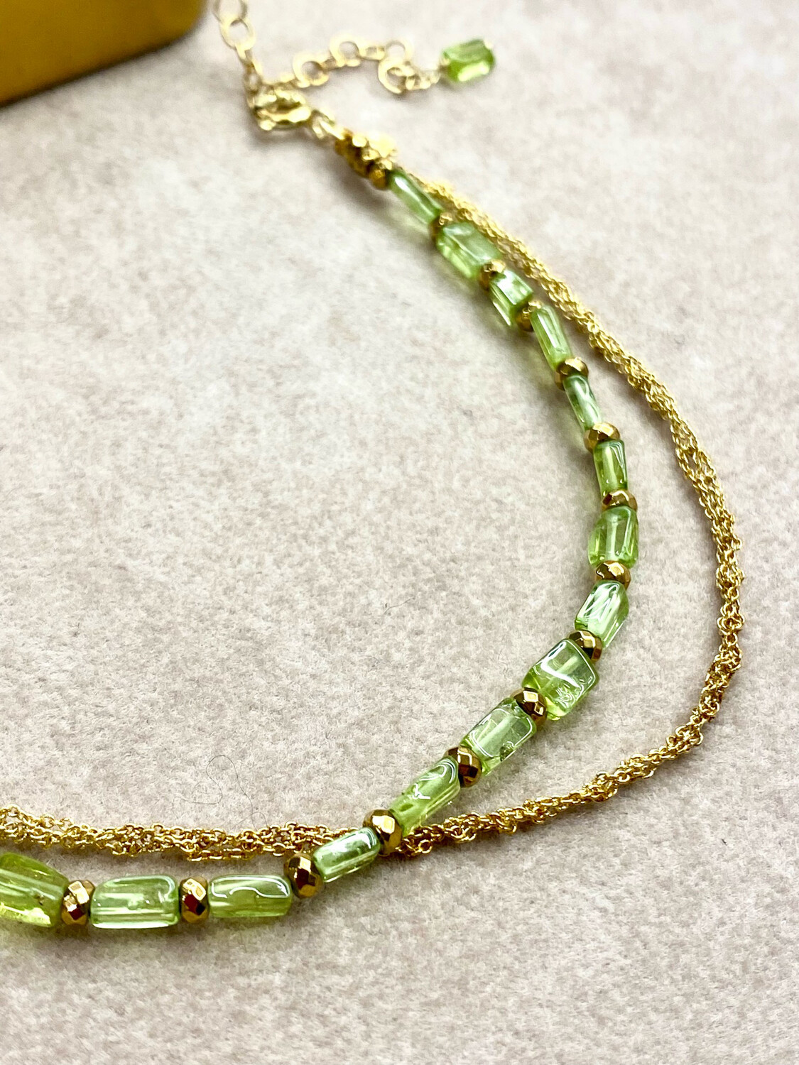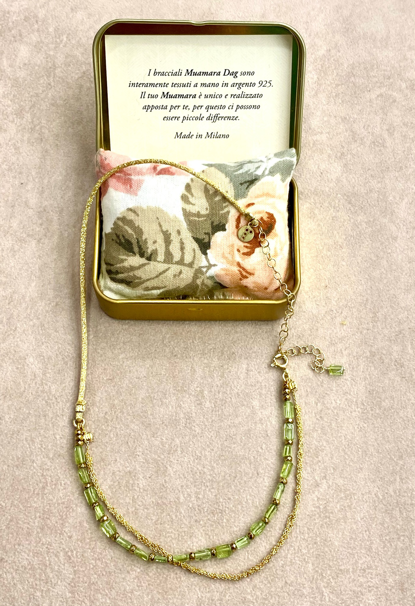 Collana girocollo due fili, lurex e tessuto argento dorato, inserti in peridoto. Lunghezza cm40 regolabile.
